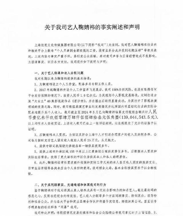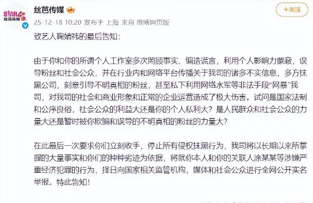 2025日,丝芭传媒再次发布声明,质疑鞠婧祎解约行为自相矛盾,指其玩文字游戏。丝芭传媒重申掌握大量事实证据,将择机公布。丝芭传媒强调长期履行合约义务,包括收入结算和资源提供。该声明延续前日回应,维护公司立场。2025日,丝芭传媒再次发文。