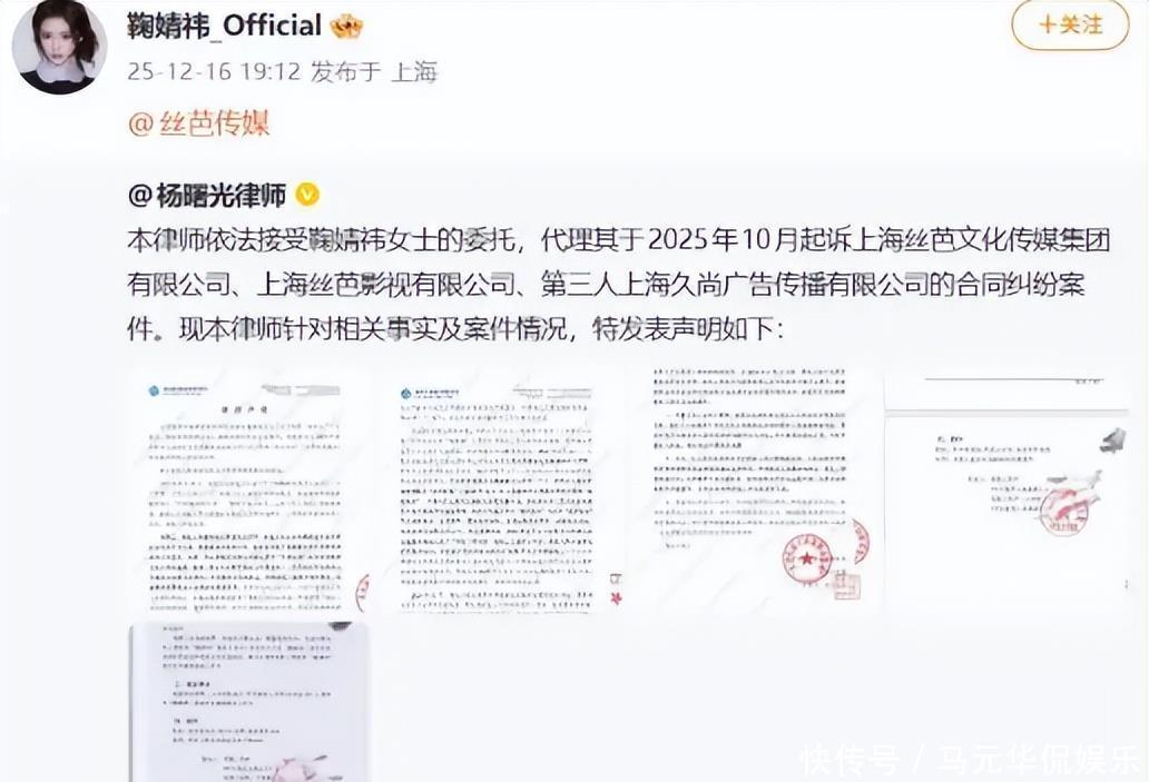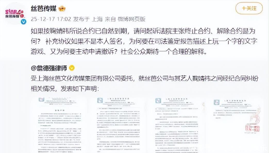 合约纠纷升级后,丝芭传媒发现多家媒体与鞠婧祎合作,包括新视线杂志社和《精品购物指南》报社。丝芭传媒向法院提起著作权权属和侵权纠纷诉讼,要求被告下架含鞠婧祎肖像和姓名的杂志内容,并删除宣传材料。丝芭传媒在起诉状中重年合约年补充协议的有效性,主张独家经纪权日。法院公开一审裁定书,丝芭传媒诉求赔偿损失,并列出事实理由,包括被告擅自与鞠婧祎合作拍摄封面照片和内页照片,并公开发售。丝芭传媒强调在合同期内,所有合作须经其同意。2025日,鞠婧祎工作室发布声明,重申合约已月终止,指控丝芭传媒存在多项违约,包括伪造补充协议和签名。声明中鞠婧祎方指出丝芭传媒长期串通关联公司,通过签订双重合同隐瞒演艺收入真实金额,截留属于鞠婧祎的收入。鞠婧祎方表示保留追究丝芭传媒法律责任的权利,并指丝芭传媒无差别骚扰合作方。丝芭传媒对该声明保持关注,准备回应。2025日,丝芭传媒发布笔迹鉴定报告,否认伪造艺人签名和授权。该报告由专业机构出具,结论支持签名真实性。丝芭传媒通过官方渠道公布报告,旨在证明补充协议合法。同一日,丝芭传媒发布关于鞠婧祎的事实阐述和声明,回应鞠婧祎散布的待遇和收入表述。丝芭传媒指出鞠婧祎称只拿到极低工资、无业务分成并受长期压榨,与事实不符。